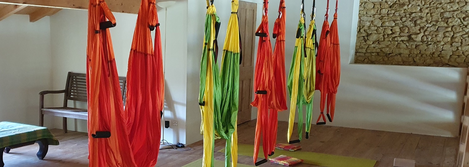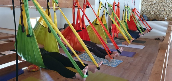 Le yoga aérien se pratique avec des hamacs de yoga, ce n’est pas une pratique acrobatique et elle ne nécessite pas de compétences particulières. La suspension permet des postures différentes favorisant les étirements en soutien du hamac, en étant « tiré » vers le haut. On prendra le temps pour installer chaque posture.